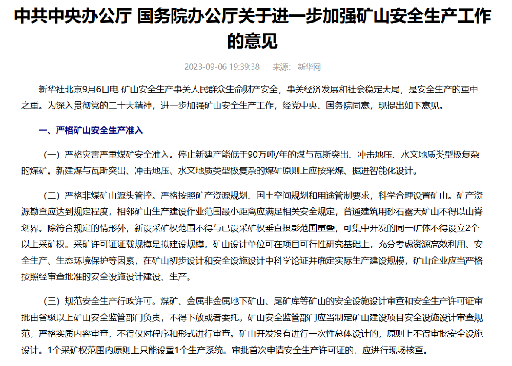 作者:南京博源国际时间:2023-09-19国务院新闻办公室于2023年9月18日(星期一)上午10时举行新闻宣布会,请国家矿山清静监察局副局长张昕、国家矿山清静监察局政策规则和科技装备司司长薛剑光、国家矿山清静监察局非煤矿山清静监察司司长李峰、国家矿山清静监察局清静基础司司长孙庆国解读《关于进一步增强···